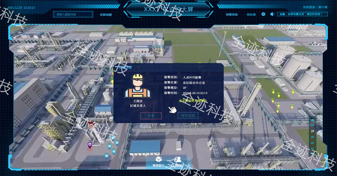 如遇超員聚集、生產事故等突發情況,工作人員可一鍵呼救(SOS),后臺管理人員可一鍵下達全員撤離指令。