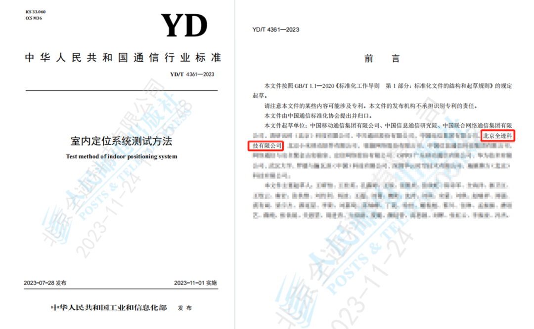 三、全跡科技參編制定《室內定位系統測試方法》,該標準由中國通信標準化協會牽頭,移動、聯通、信通院等企業參與起草。標準描述了室內定位系統的測試環境及性能、系統功能的測試方法。該標準于2023年7月28日由中華人民共和國工業和信息化部發布,2023年11月1日實施。