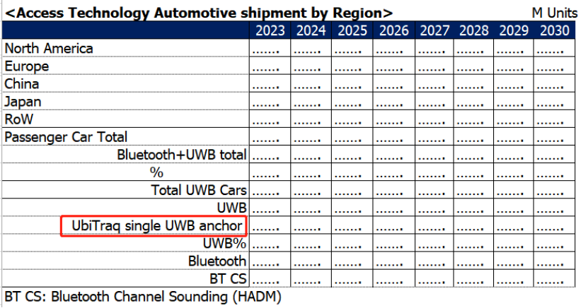 更重要的是,在新報(bào)告的汽車數(shù)字鑰匙出貨量預(yù)測中,全跡科技UWB-AOA產(chǎn)品被作為一項(xiàng)獨(dú)立技術(shù),與傳統(tǒng)UWB、藍(lán)牙鑰匙并列(下表中的UbiTraq single UWB anchor),被單獨(dú)預(yù)測其出貨量與市場占有率。這是國際專業(yè)機(jī)構(gòu)對全跡科技行業(yè)領(lǐng)先的創(chuàng)新能力、技術(shù)能力與產(chǎn)品能力的極大認(rèn)可!