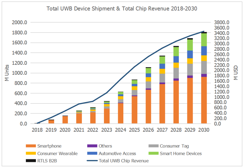 注:TSR(Techno Systems Research)是一家總部位于日本,面向全球的市場分析公司。TSR為客戶提供多個(gè)高科技領(lǐng)域深入的市場研究報(bào)告。TSR歷年發(fā)布了多份UWB市場分析報(bào)告,因其數(shù)據(jù)詳實(shí)豐富而聞名。其專業(yè)的統(tǒng)計(jì)數(shù)據(jù)經(jīng)常被全球各類UWB行業(yè)分析文章引用,例如下面這張來自2022年TSR報(bào)告的插圖,相信行業(yè)內(nèi)不少小伙伴都看過。