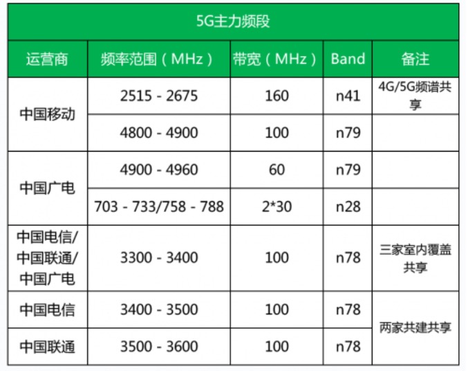 我國運營商5G主力頻段如下: