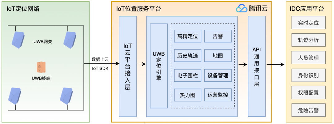 云化UWB高精度定位智能管控系統(tǒng)主要包括兩個模塊,即 IoT UWB定位網(wǎng)絡(luò)、IoT位置服務(wù)平臺,通過API通用接口層與上層的IDC應(yīng)用平臺交互,如下圖所示: